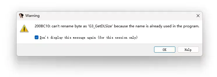 选择好文件后,我们可能会收到很多这样的提示,勾选 Don’t display this message again (for this session only)(对此次会话不再显示)后确定即可。(因为可能有部分符号已经被 IDA 自动命名了所以会冲突,我们无需太过在意)