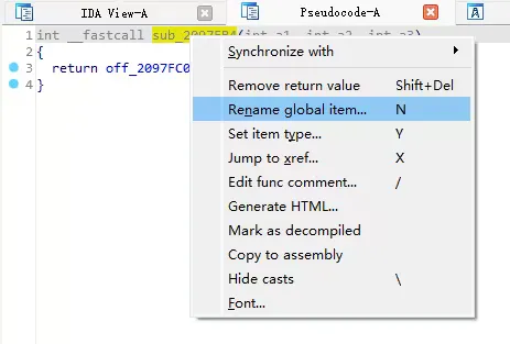 我们右键伪代码的函数名,选择 Rename global item…(重命名全局命名)(你也可以对准光标然后按下 N 键)