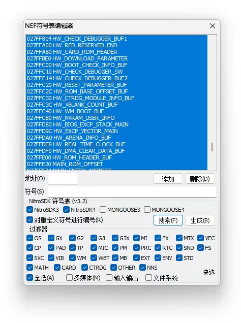 可以看到编辑器的窗口下面已经有了几种符号表给我们使用,还有符号过滤功能,不过我们为了之后方便可以直接全选,然后符号表我们选择 NitroSDK3 和 NitroSDK4(我们并不清楚游戏使用了哪个版本的 SDK 所以直接全部要),如果需要还可以勾选 对重定义符号进行编号(搜索过程中可能会存在多个相同的符号,勾选之后可以避免冲突和误读):